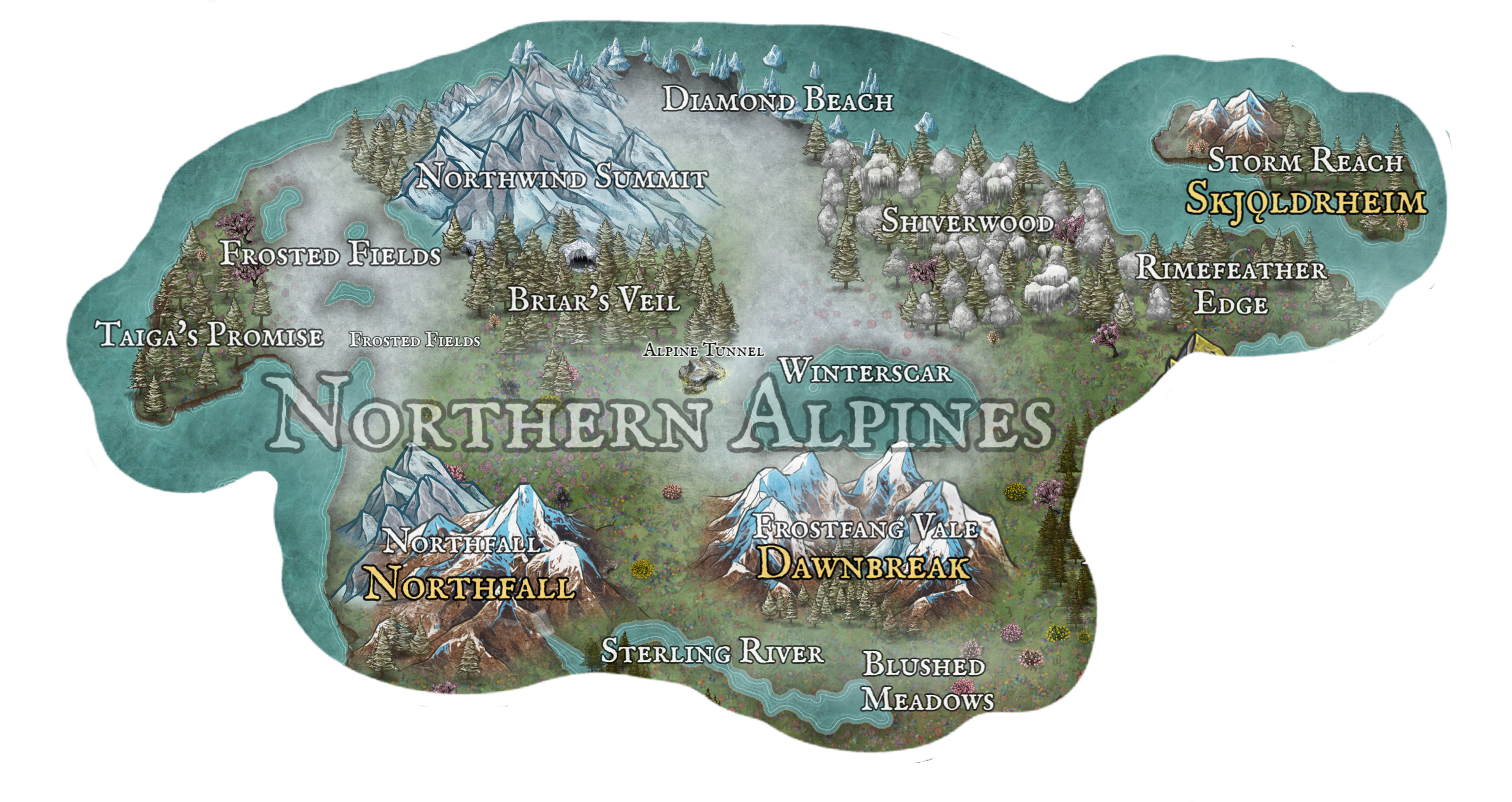 Internal TerritoriesBlushed MeadowsBriar's VeilDiamond BeachFrosted FieldsFrostfang ValeNorthfallNorthwind SummitRimefeather EdgeShiverwoodSterling RiverStorm ReachTaiga's PromiseWinterscar